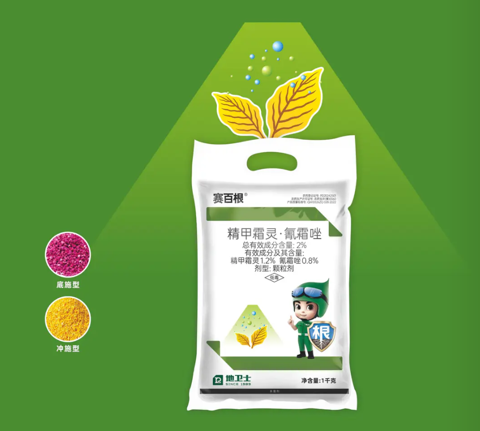 “赛百根” 是一款含 2% 精甲霜灵・氰霜唑的颗粒剂产品,登记证号为 PD20242501。精甲霜灵和氰霜唑二者复配,能有效针对引发根腐病、黑胫病等病害的病菌,形成强大的防线。产品有底施型(粉色颗粒)和冲施型(黄色颗粒)两种类型,可满足不同作物在不同生长阶段的使用需求,为作物全生育期的健康生长提供保障。