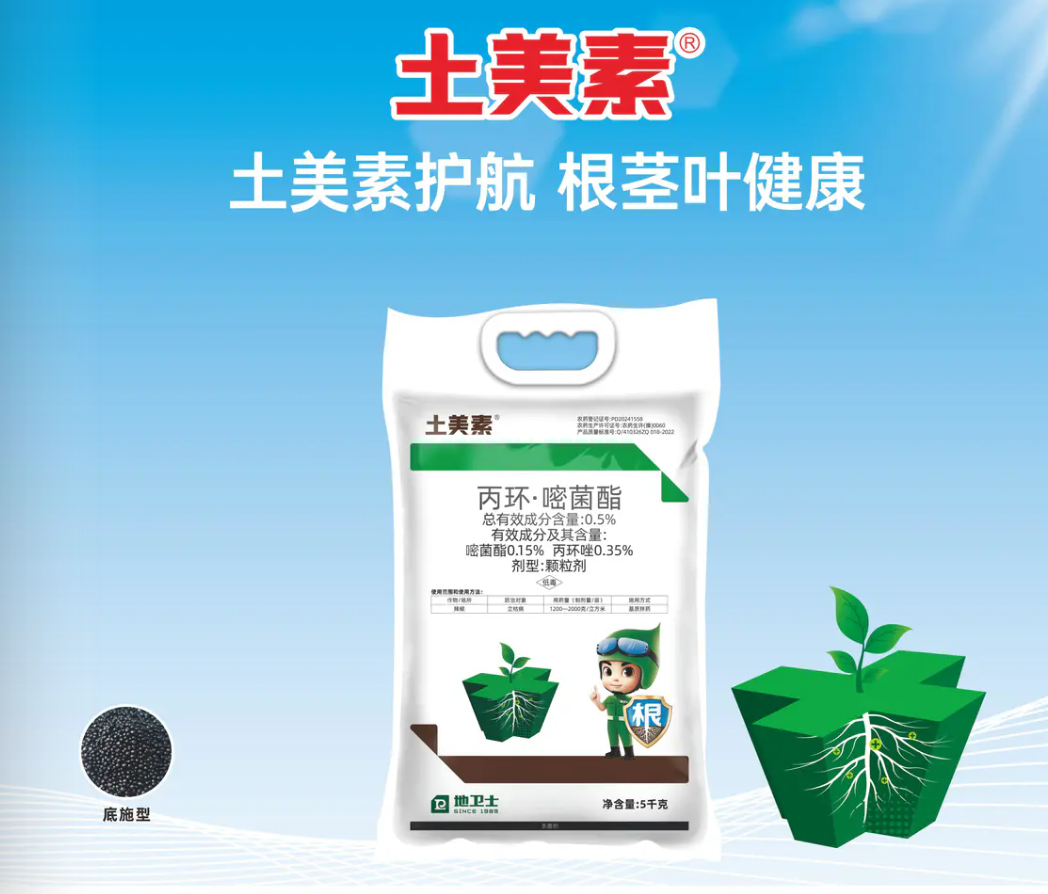 土传病害、苗期纹枯病、叶斑病等问题,是种植户们比较关注的方面。“土美素 ®” 是一款含 0.5% 丙环・嘧菌酯的颗粒剂产品,登记用于防治辣椒立枯病,有 1 千克 ×10 袋 / 箱(底施型)、5 千克 ×4 袋 / 箱(底施型)两种规格。它融合了三唑类与甲氧基丙烯酸酯类杀菌剂,经作物根部吸收后,能在作物体内传导分布。